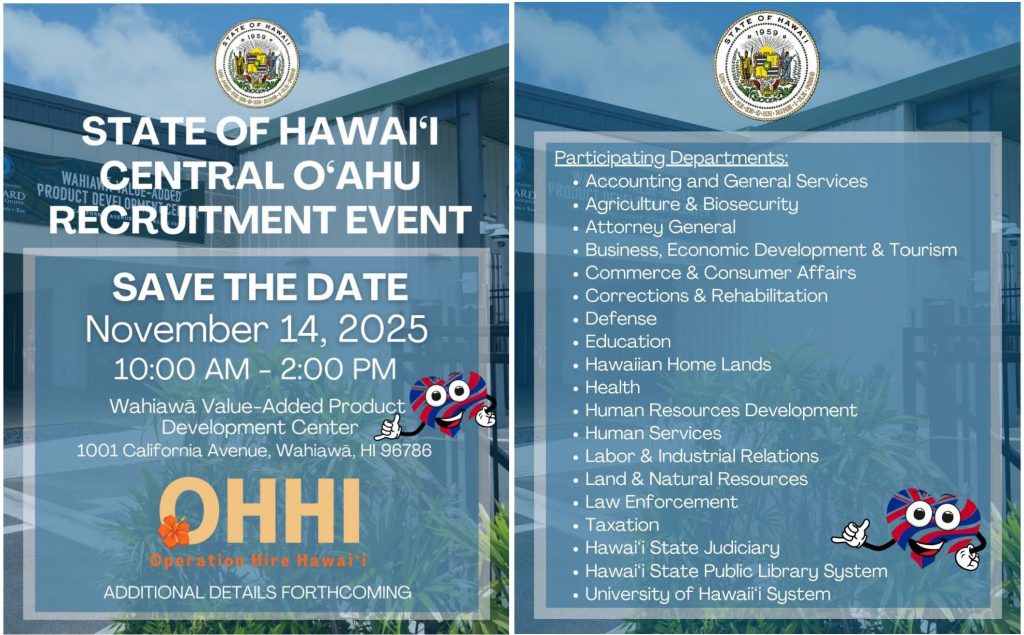 Operation Hire Hawaiʻi (OH-HI) is a targeted outreach initiative featuring an expedited state hiring process, fast-tracking qualified candidates into job opportunities throughout Hawaiʻi. This project aims to provide opportunities for individuals impacted by layoffs, resignations, loss of federal funding, and other interested job seekers. The State of Hawai’i is committed to respecting and valuing its employees. We welcome all applicants!